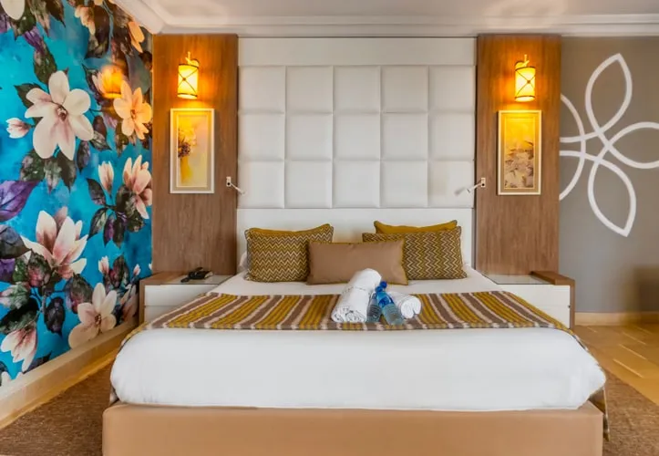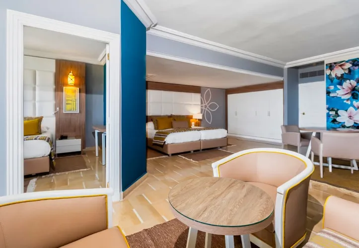 Les chambres sont réparties dans un bâtiment de 3 étages avec ascenseurs, dotées de salle de bains avec toilettes séparés, sèche-cheveux, téléphone, climatisation, petit réfrigérateur, TV satellite, coffre-fort (gratuit). Balcon ou terrasse. Vue mer latérale ou frontale. Possibilité de chambres communicantes ou familiales (avec séparation) pouvant recevoir au maximum 4 adultes.