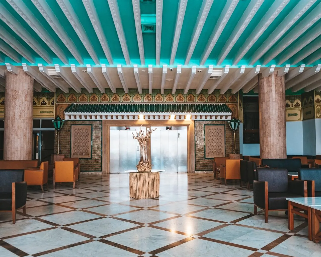 • Bâtiment principal : il y a la réception, le bar «La Palme d’Or», le restaurant principal Buffets «La Fontaine», le restaurant gastronomique «Newspaper», la salle de lecture « Les Fougères », une salle de bridge, le café maure « l’Oasis », des suites et des chambres.