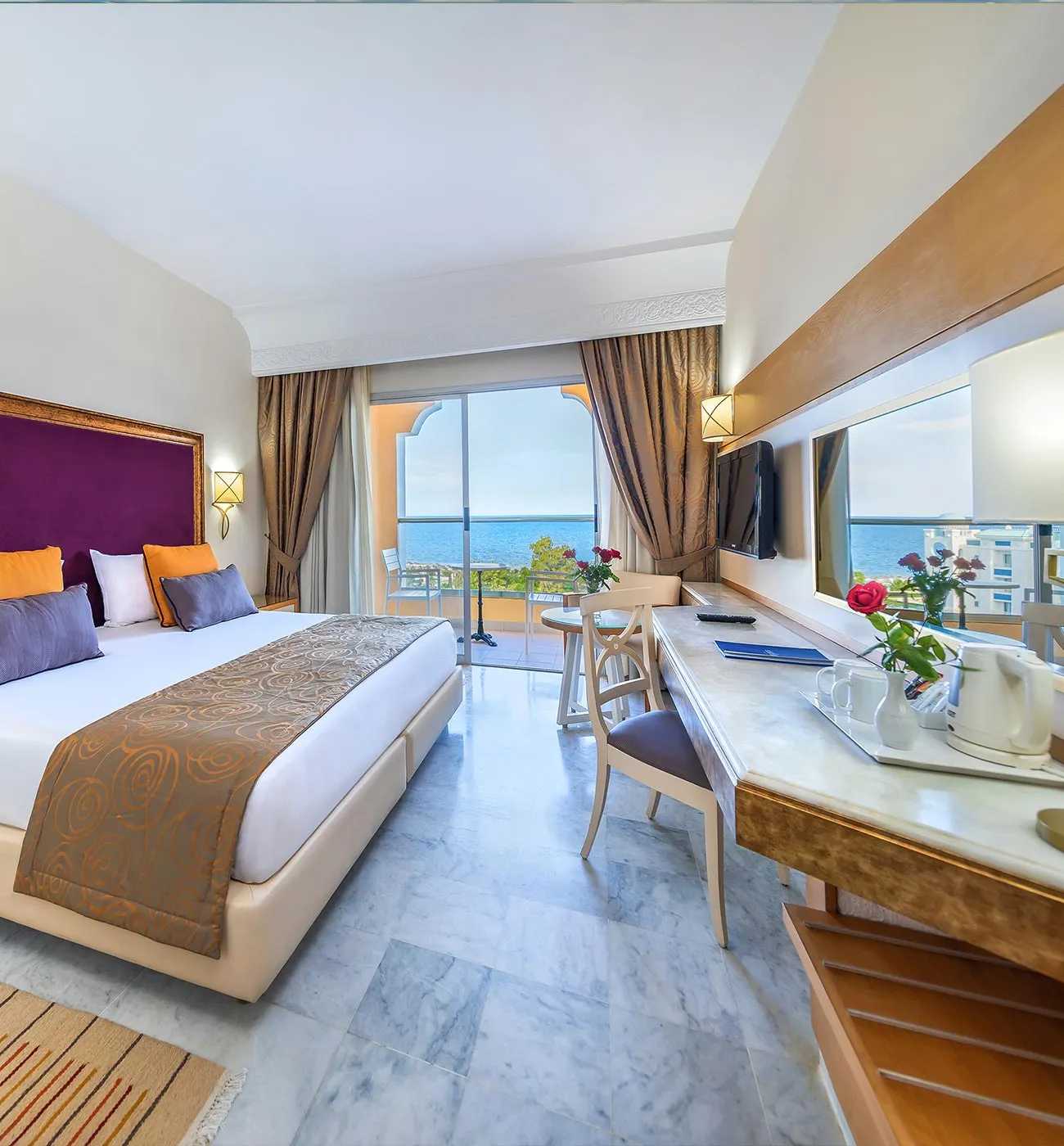 S’éveiller face au terrain de golf, faire une balade en bord de mer, flâner dans les ruelles pavées du port de plaisance, ou simplement se détendre au bord de la piscine. Marhaba Palace est l’endroit rêvé pour un séjour inoubliable. À table, collection de grands vins et cuisine locale aux saveurs de thym et de basilic assurent le bonheur des papilles. Cet hôtel de charme en plein cœur de la station balnéaire du Port El Kantaoui vous séduira également par son accueil personnalisé et par un service aussi efficace que discret.